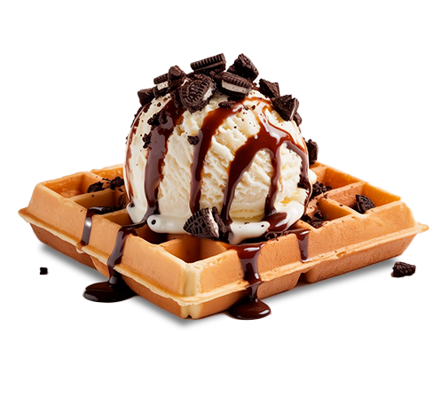 Oreo Love: Our warm, fluffy waffle is loaded with crushed Oreo cookies, blanketed in rich melted chocolate, and finished with a decadent drizzle of chocolate syrup. Pure chocolate indulgence.