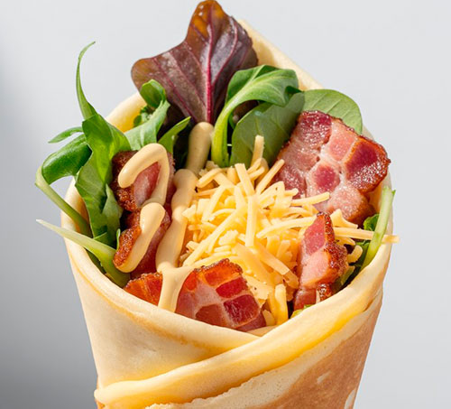 Savory Perfection: A crepe filled with crispy bacon, sharp cheddar cheese, mixed greens, and Dijon sauce. A bold and satisfying choice.
