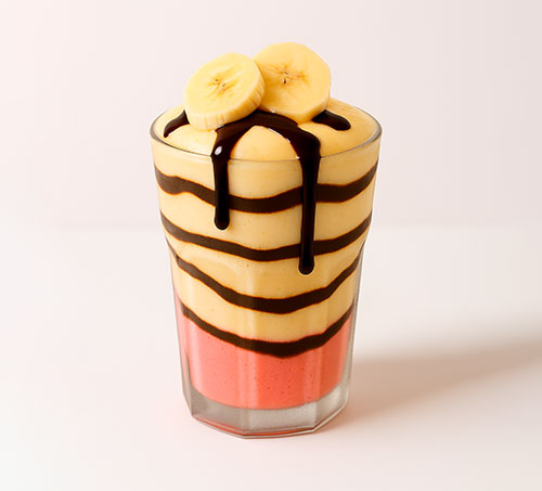 Classic Twist: A milkshake blending banana, strawberry, and vanilla ice cream with chocolate syrup. A nostalgic dessert in a glass.