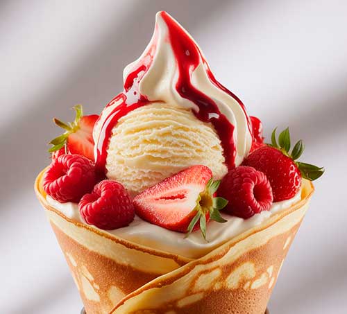 Indulge in Bliss: A heavenly crepe bursting with juicy strawberries, tangy raspberries, creamy mascarpone, and a drizzle of berry syrup. A vibrant treat to awaken your taste buds.