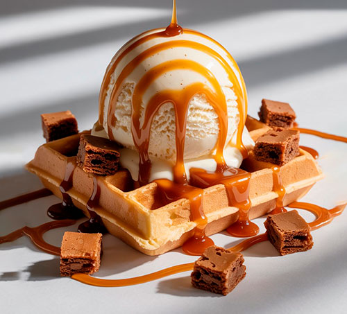 Golden Bliss: A waffle with dulce de leche, brownie, and caramel drizzle. A dreamy sweet escape.