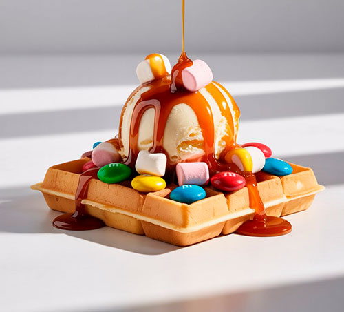 Colorful Crunch: A waffle topped with M&M’92s, marshmallows, and caramel drizzle. A vibrant and joyful dessert.