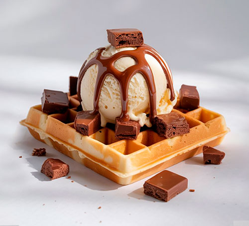 Choco Overload: A decadent waffle with brownie chunks, Nutella, and dark chocolate. Perfect for chocolate lovers.