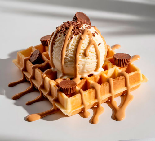 Nutty Delight: A waffle with Reese’92s, peanut butter, and dark chocolate. A bold treat for peanut fans.