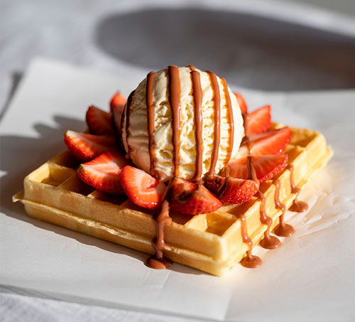 Sweet Temptation: A golden waffle topped with fresh strawberries, sweet condensed milk, and creamy Nutella. A classic treat to satisfy your sweet tooth.